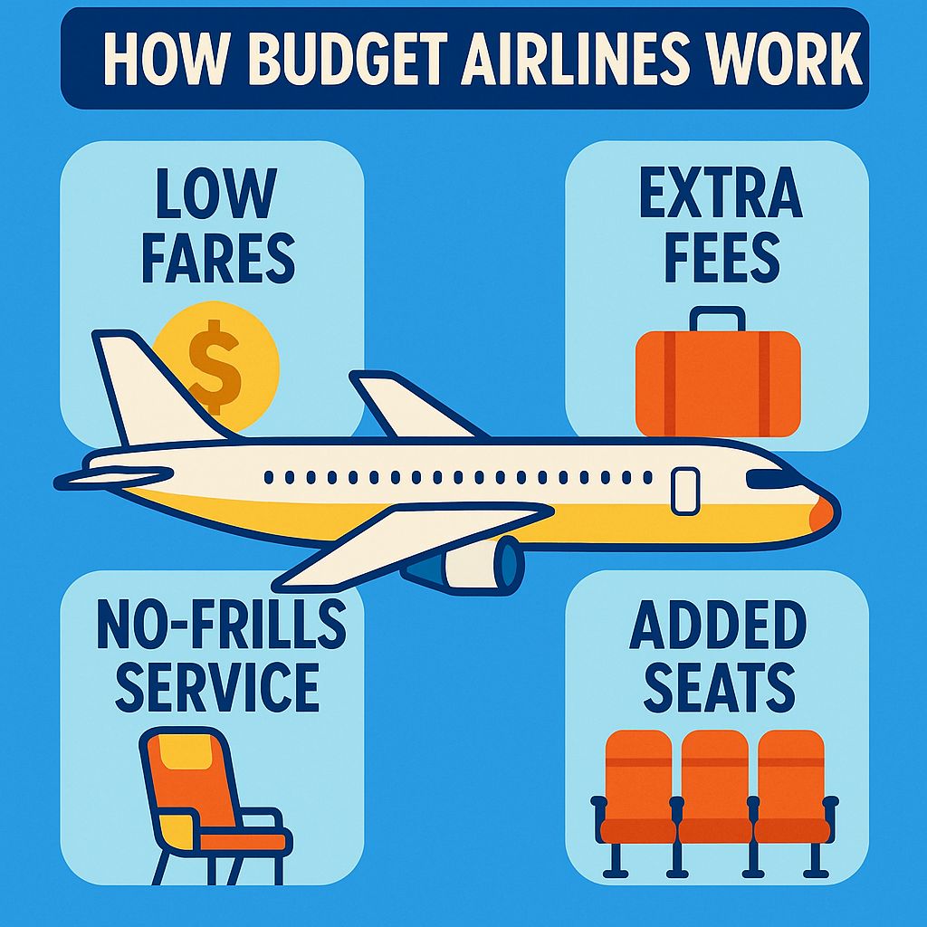 A budget airline (also called a low-cost carrier) is a no-frills airline that keeps ticket prices super low by cutting out anything extra.